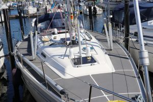 Hela däcket erbjuder ett mycket bekvämt grepp, är lätt att underhålla, det finns endast teakdäck i sittbrunnen som skulle kunna få några timmars lätt renovering för att ge det sin glans tillbaka.