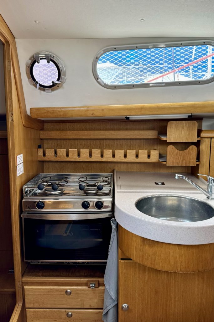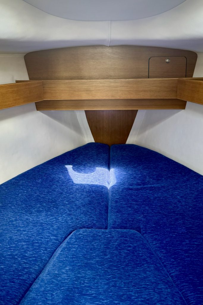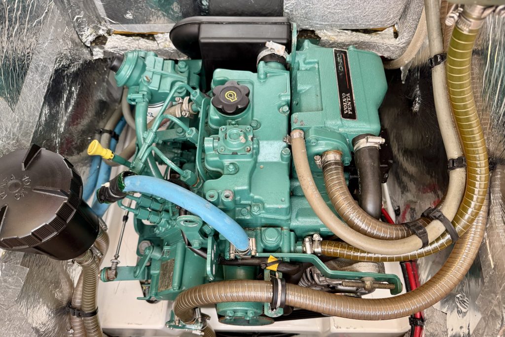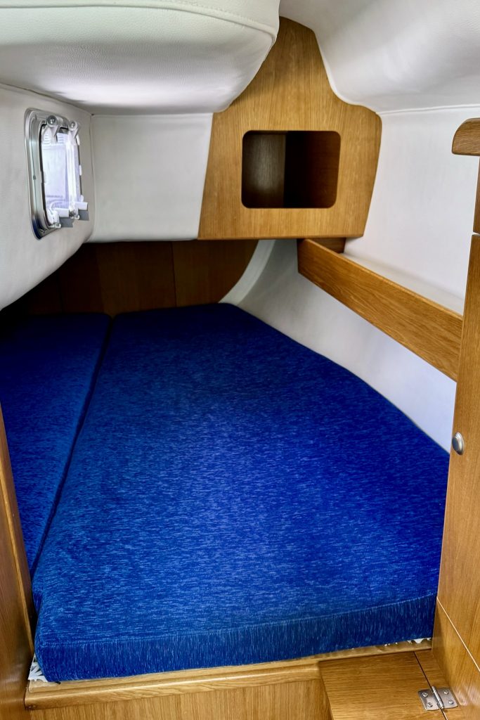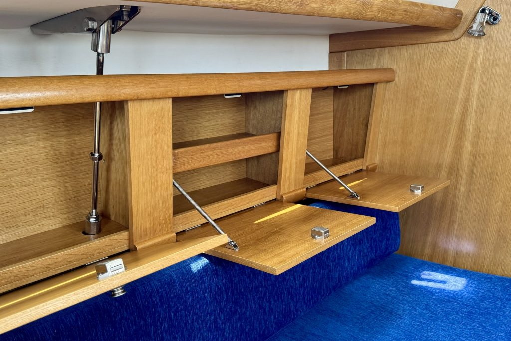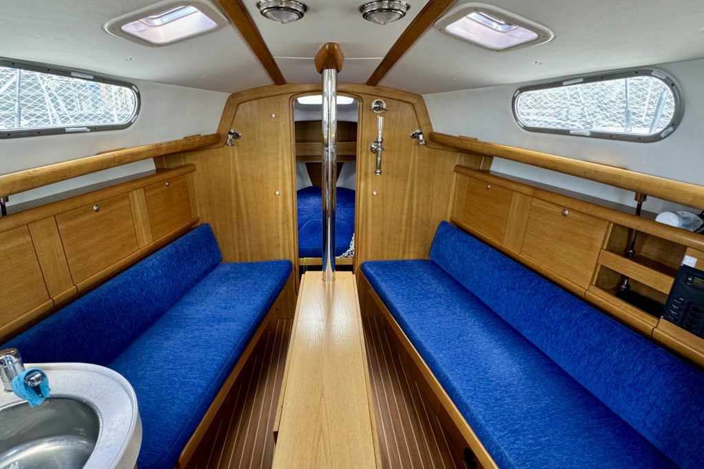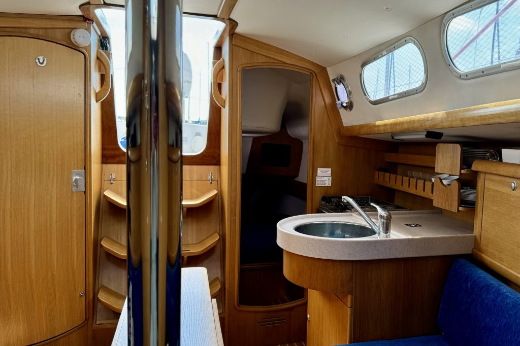 Interiören är väl utformad med ett bra pentry, en välutrustad salong med ett fällbord och bekväma sovhytter. Eftersom hon säljs av den andra ägaren har hon regelbundet uppdaterats och väl underhållits med nya navigationsinstrument och batterier (2021), nya dynor (2023) och segel i utmärkt skick (2017/2019), se vidare i utrustningslistan.