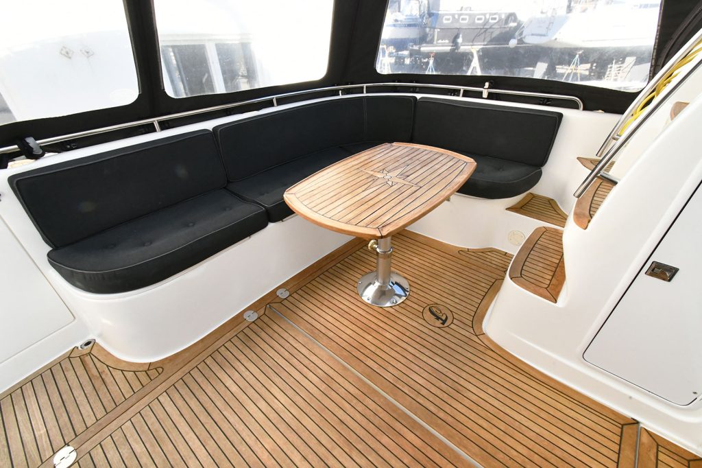 Båten har en ljus och luftig planlösning som förstärks av den ljus teak inredningen.