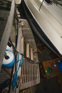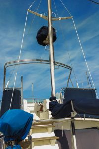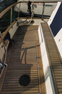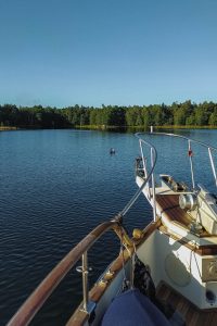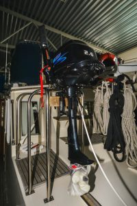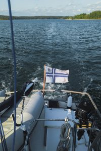 På akterhyttens tak förvaras jollen som behändigt kan sjösättas med hjälp av bommen på masten.