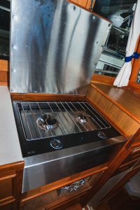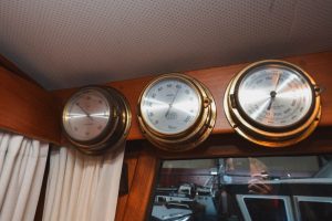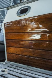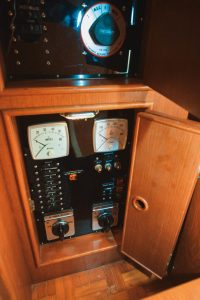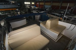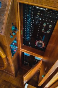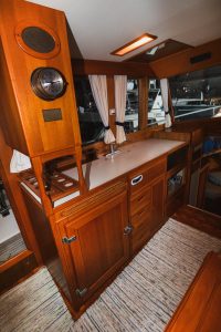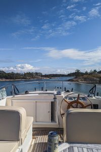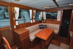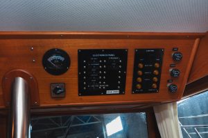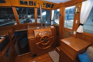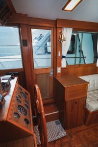 Till styrbord ligger styrplatsen med all nödvändig elektronik och teknik bekvämt åtkomligt. Via dörren kommer skepparen vid behov behändigt direkt ut på däck vid tex. hamnmanövrar.
