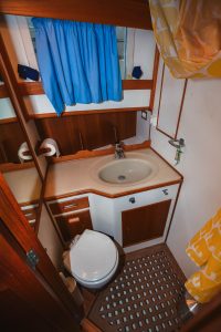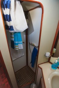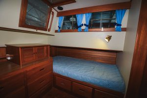 Den lyxiga ägarhytten ligger i aktern och har egen WC med separat duschutrymme, rejält med stuvutrymmen samt utgång till akterdäcket.