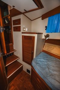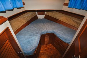 I fören är en rymlig hytt med stor V-koj, mycket lådor och skåp samt ingång till WC med dusch.