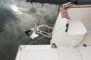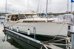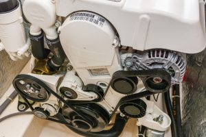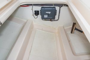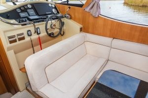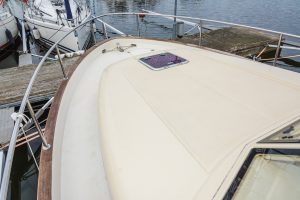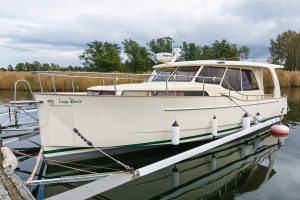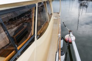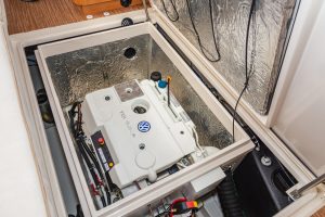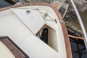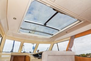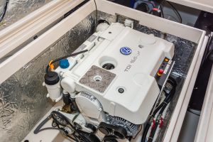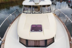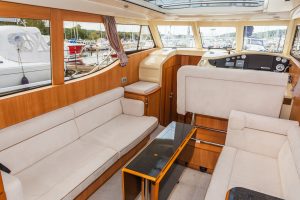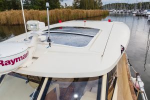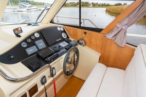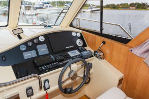 Från båtens förarplats har man full översikt över alla instrument och navigationsutrustning. Den välisolerade femcylindriga motorn nås enkelt under durken i salongen för service och inspektion. Denna båt har endast ca 280 motortimmar och har nyligen genomgått en omfattande rekond av hela skrovet och inredning.