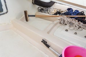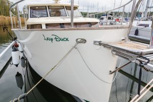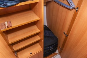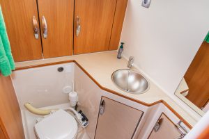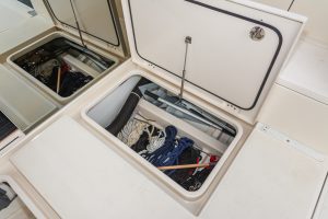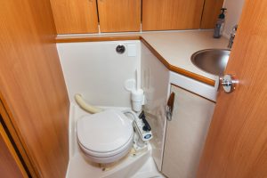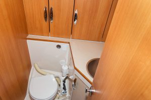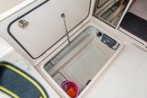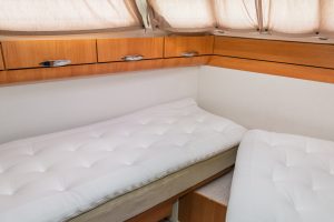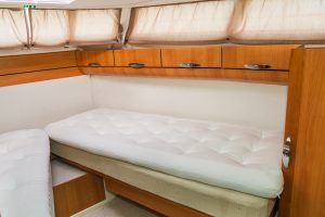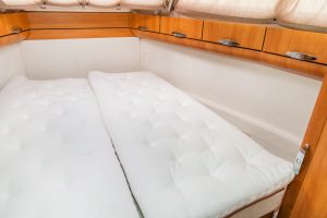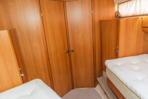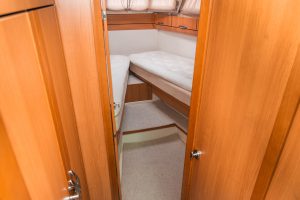 Under däck, en halv trappa ner, finns en rymlig hytt med två rejäla kojer. Med ett enkelt handgrepp kan de skjutas ihop till en stor dubbelsäng. Här finns även en toalett med dusch samt gott om förvaring.