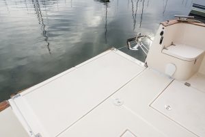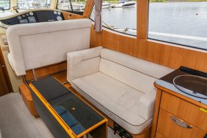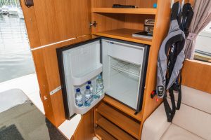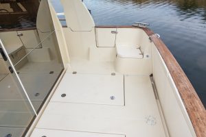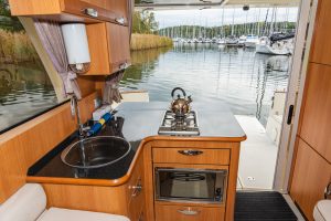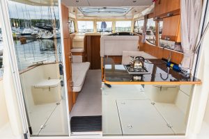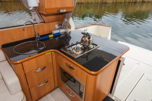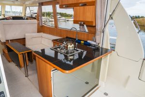 Redan när man kliver ombord märks det att Greenline är en båt full av smarta lösningar. Ytan från akterdäck in mot salong och pentry är helt sömlös. Pentryt, som snarare kan beskrivas som ett utomhuskök mellan salong och akterdäck, är fullt utrustat med gasolspis, ugn och gott om förvaringsutrymmen. Denna båt har dessutom en extra frys.