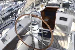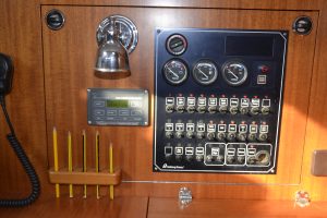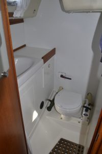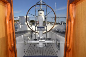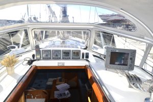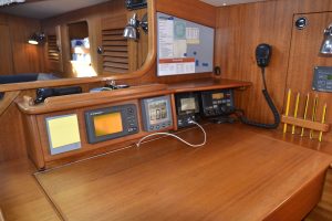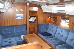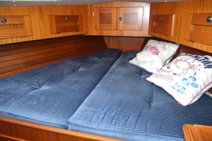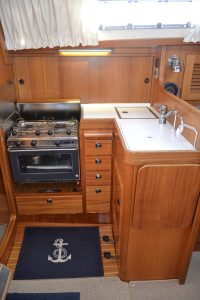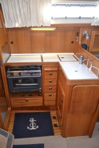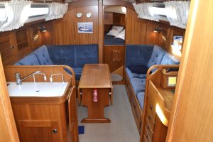 Pentryt ligger på babordssidan och har bland annat gasolspis med ugn, vattenkyld kylbox med frysfack och gott om arbetsytor. På andra sidan finns navigationsplatsen med massor av plats till navigation, men också till hemma arbetplatsen på resan. I förpiken finns två reella och bekväma kojer och gott om förvaring. Akterut finns en separat kabin, också med dubbelkoj. Sist men inte minst, en ljus toalett med duschmöjligheter.