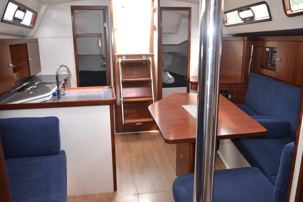 Denne Hanse 350 er en af de tidlige, hvor sælger valgte den tidlige version med toilettet fremme, hvilket gav mulighed for en extra mindre agterkahyt, som samtidig kunne anvendes som et kæmpe opbevaringsrum til extra sejl, cykler, sammenpakket gummibåd, paddle boards eller hvad man nu kunne få brug for på den længere ferie.