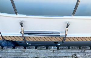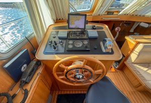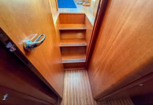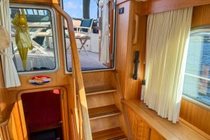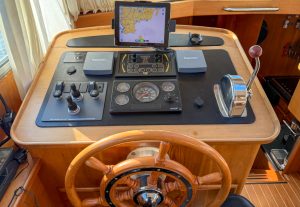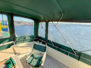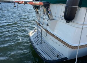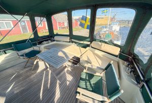 När man kommer ombord, ofta via en av grindarna på vardera sidan av det solida mantåget, så är man direkt skyddad på det rejäla, teakklädda däcket. Allt är mycket rejält, inklusive den rejäla relingen med ett solitt mantåg i rostfritt. Det finns räcken och handtag att hålla sig i princip överallt, en del orginal från varvet och en del som tillagda av den erfarna, nuvarande, ägaren.