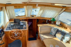 Från poopdäcket föröver når man den generösa däckssalongen. Här har man fin runtomsikt och har alltid bra kontakt med omvärlden, både under gång och i hamn eller vid ankar. I däckssalongen finns också den fartygsliknande inre styrplatsen.