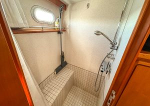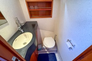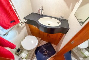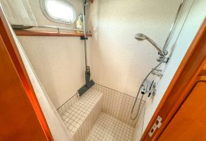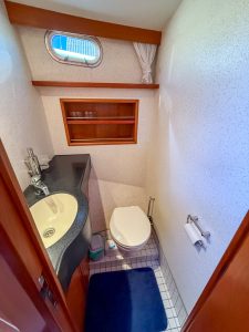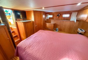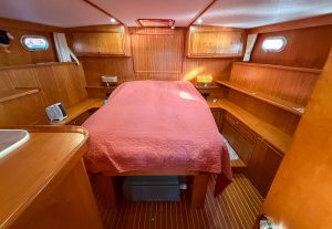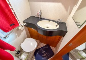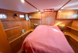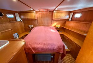Ytterliga en bit föröver nås gästhytten med en över och undersats, samt ett separat badrum på styrbordssidan.