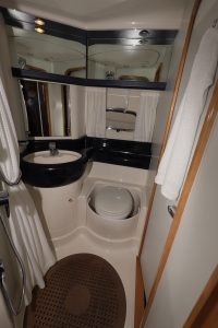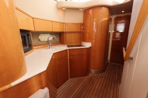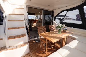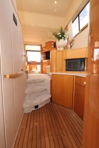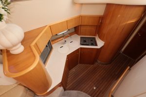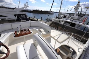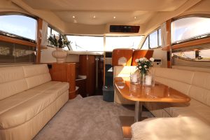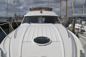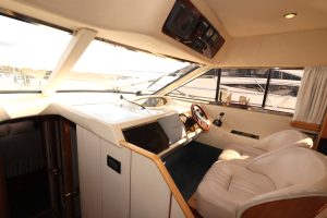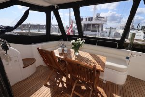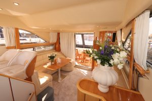 Ägaren har verkligen satsat stort på båten och har sett till att den är mycket väl underhållen. Det är ståhöjd överallt, och du kommer att älska att sitta i hamn och njuta av en kopp kaffe med vännerna på "flybridge", eller på den härliga verandan akterut. Träet i salongen, inredningen etc. är verkligen stärkande.