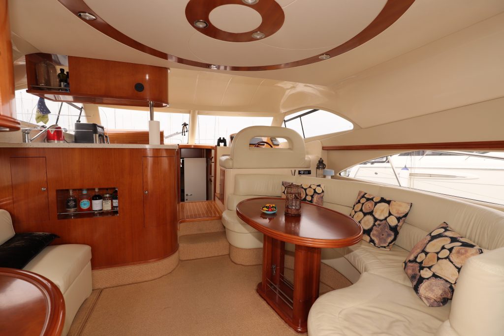 På flybridgen finns det, förutom styrplatsen, en trevlig soffa och plats att sola. Det finns även ett handfat och ett kylskåp på flybridgen.