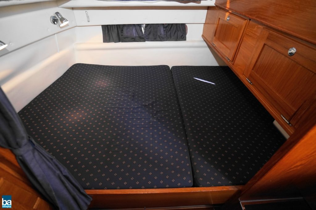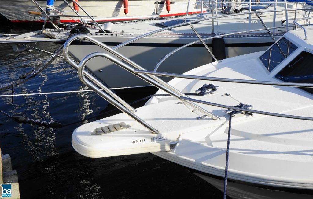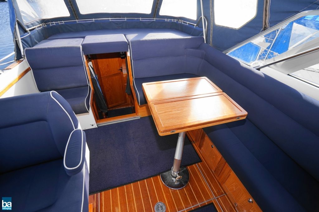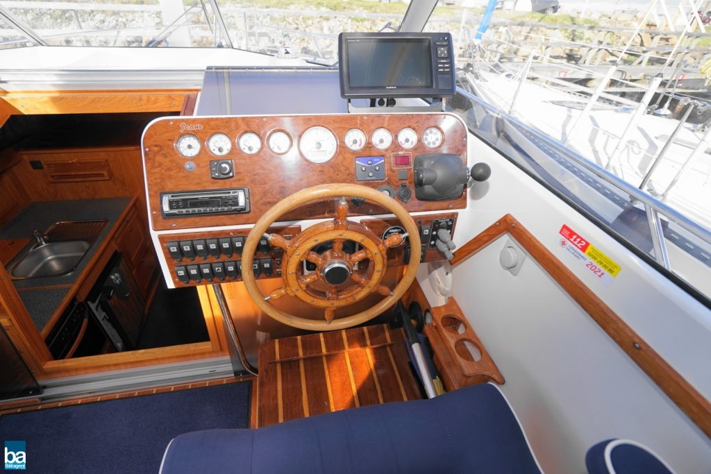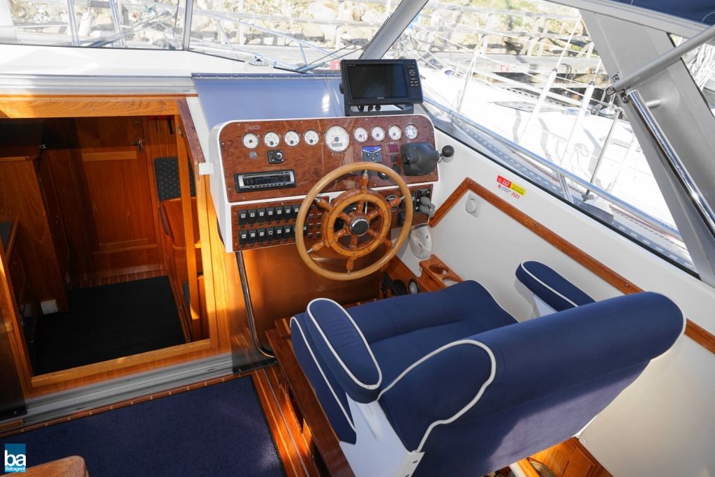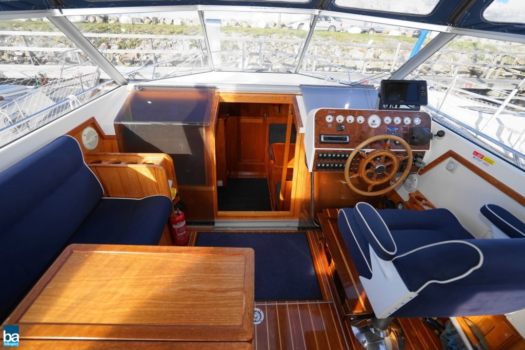 Förarplatsen är bekväm med höj/sänkbar stol och alla reglage och navigeringsutrustning väl synliga och åtkomliga. Panelen inrymmer en ny Garmin navigator, reglage för bog/akter propellrar och trimplan.