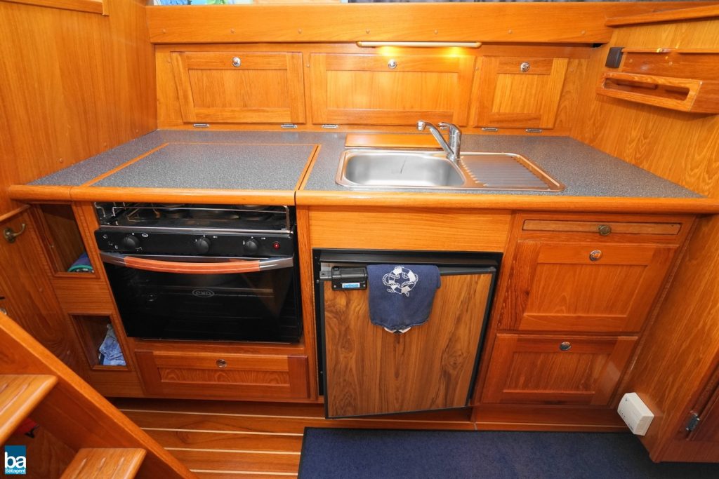 Pentryt är rejält med arbetsytor, tvålågig gasolspis med ugn, vask med varmt och kallt rinnande vatten. Gott om stuvutrymme för köksutrustning mm.