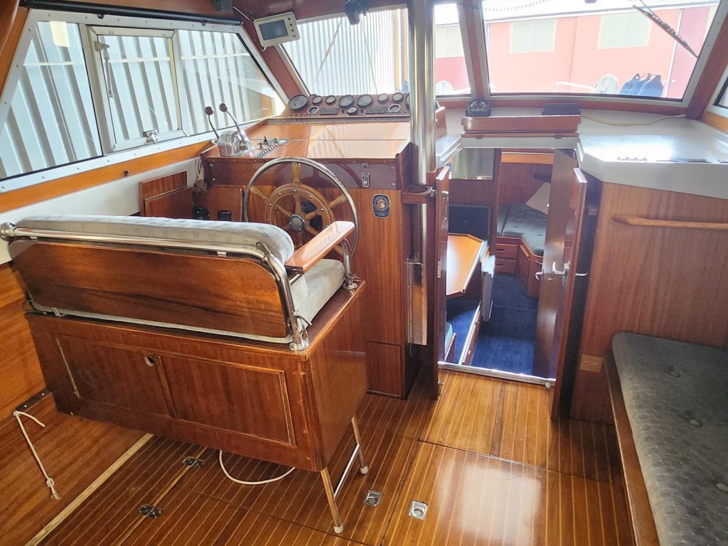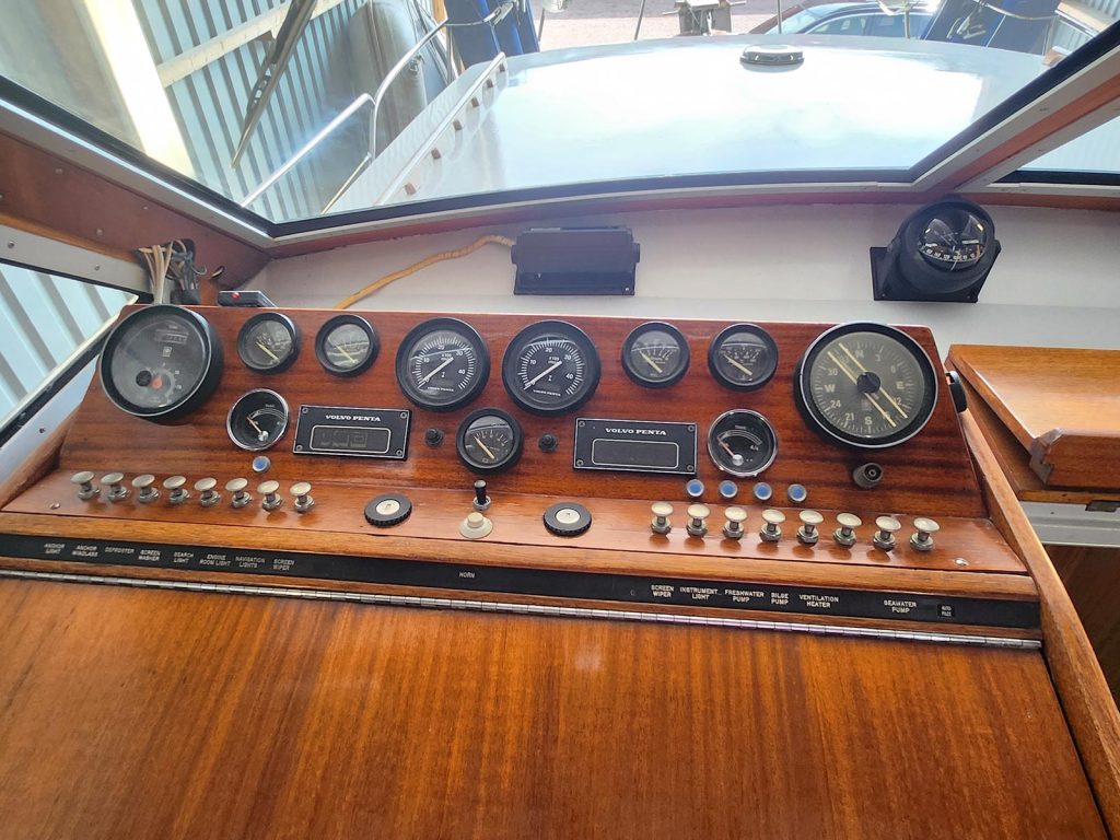 Denna fina Storebro Royal Cruiser 34 med plastskrov och klassisk mahogny överbyggnad har en påbyggd flybridge (1999), modifierad från Storö 40 av båtsnickare på Tjörn.
