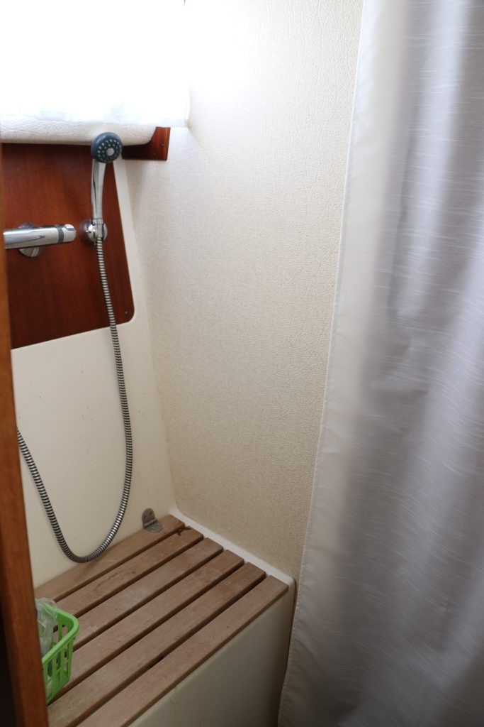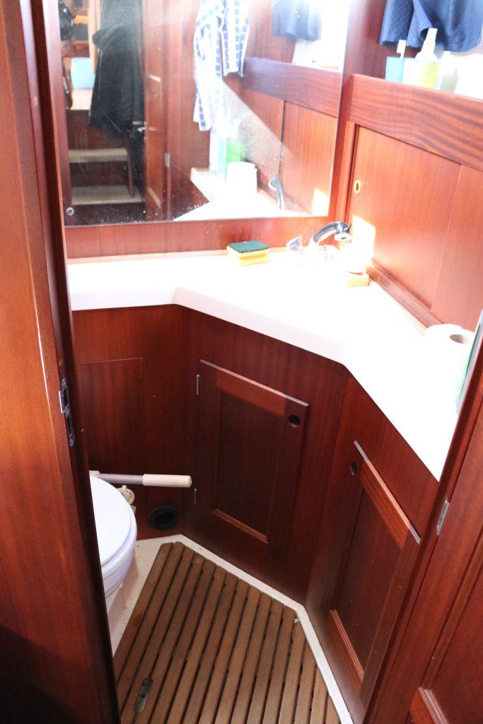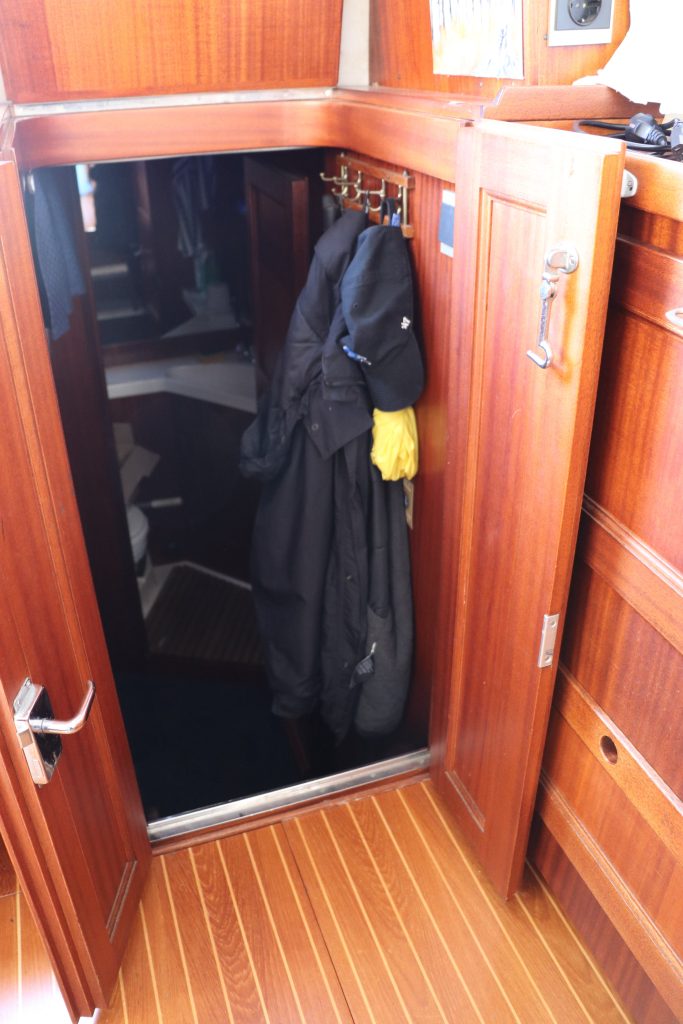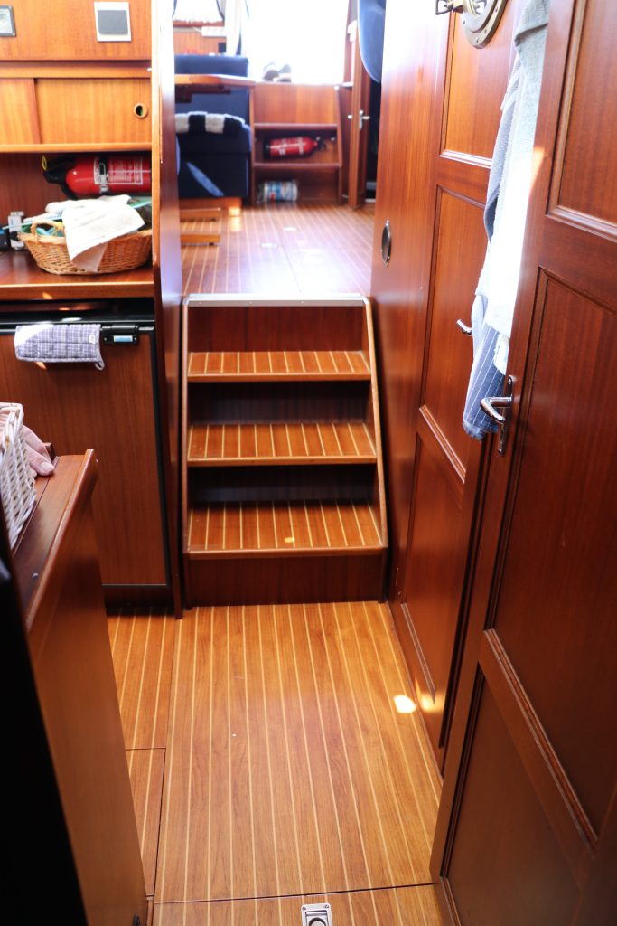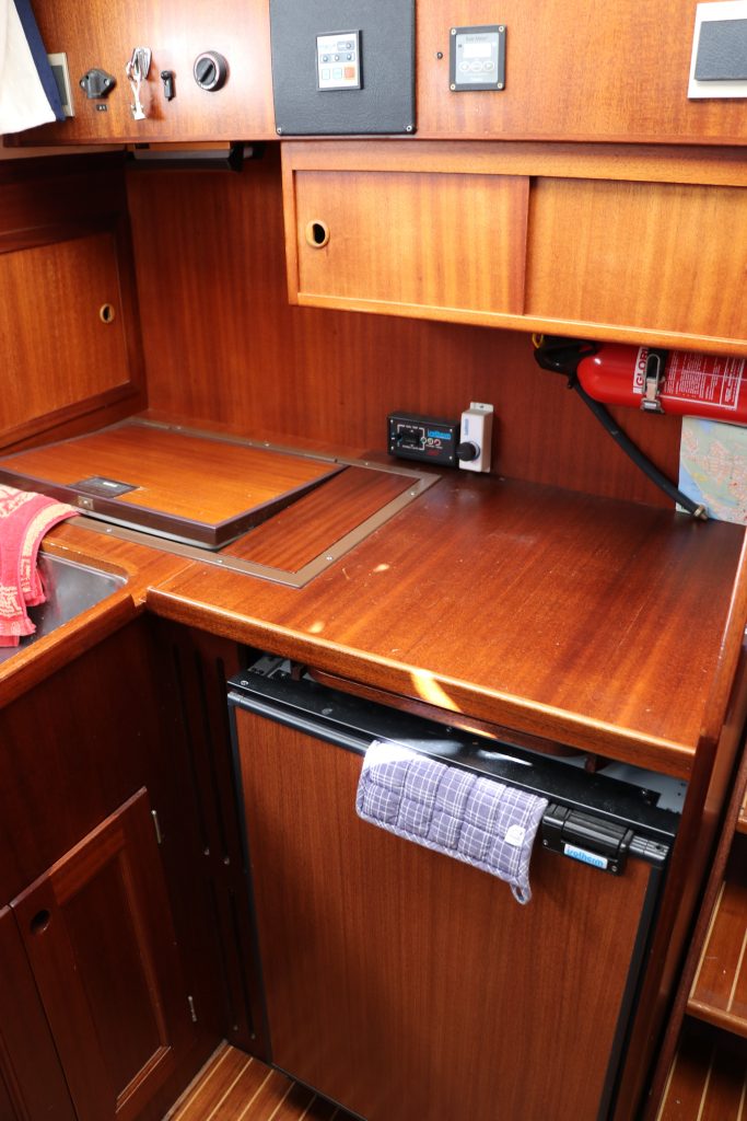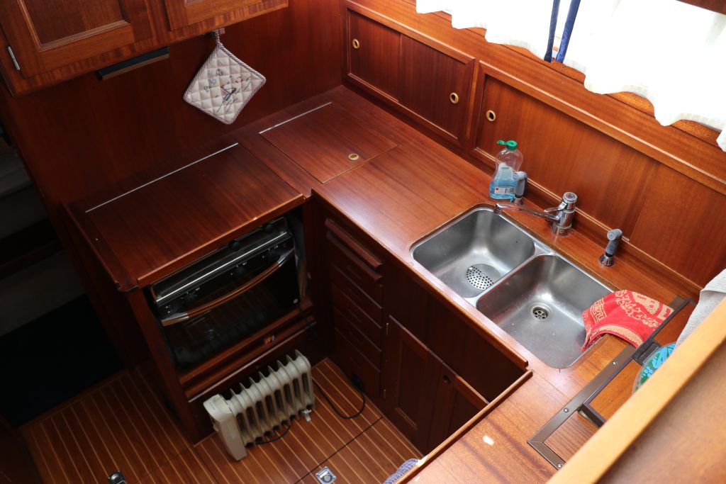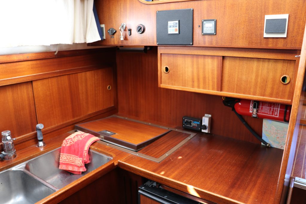 Pentryt ligger några steg ner till styrbord och är utrustat med spis inklusive ugn, köksfläkt, kylskåp, diskho och gott om förvaringsutrymme.