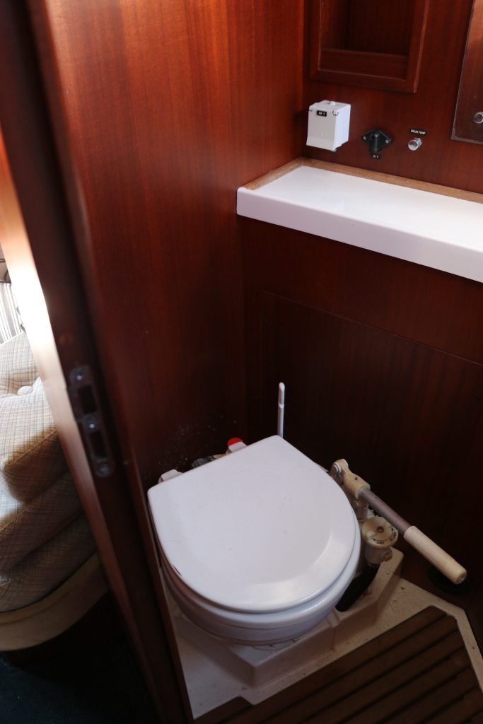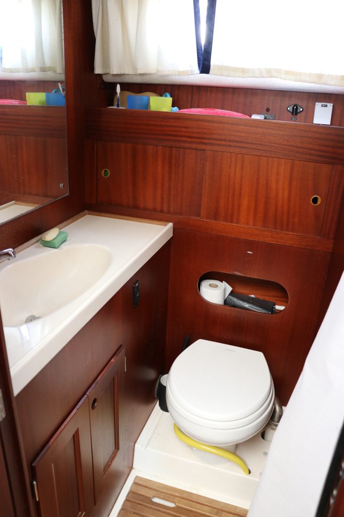 Den mycket rymliga ägarkabinen i fören har en stor säng, gott om förvaringsutrymme och egen tillgång till badrummet med separat dusch och toalett.
